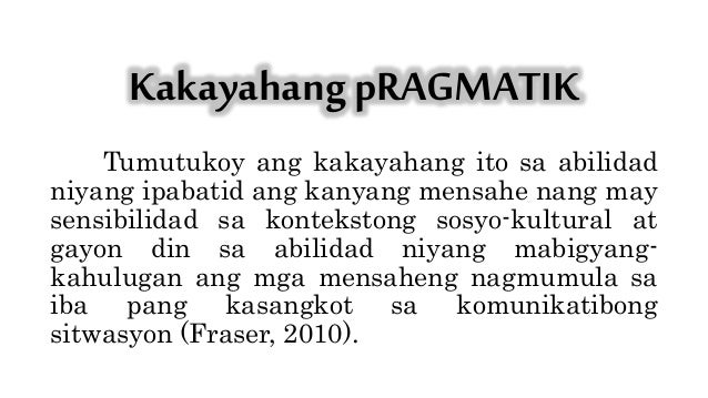 Kakayahang magamit ang verbal at di verbal na mga hudyat upang maibatid nang mas malinaw ang mensahe at maiwasan o maisaayos ang mga hindi pagkakaunawaan o mga puwang gaps sa komunikasyon. Ang kakayahang lingguwistiko ay naglalarawan sa kapabilidad ng isang indibidwal na bumuo at umunawa ng tama at makahulugang pangungusap. Ang kakayahang gramatikallingguwistik ay tumutukoy sa kaalamang leksikal at pagkaalam sa tuntunin ng ponolohiya morpolohiya sintaks at semantiks.