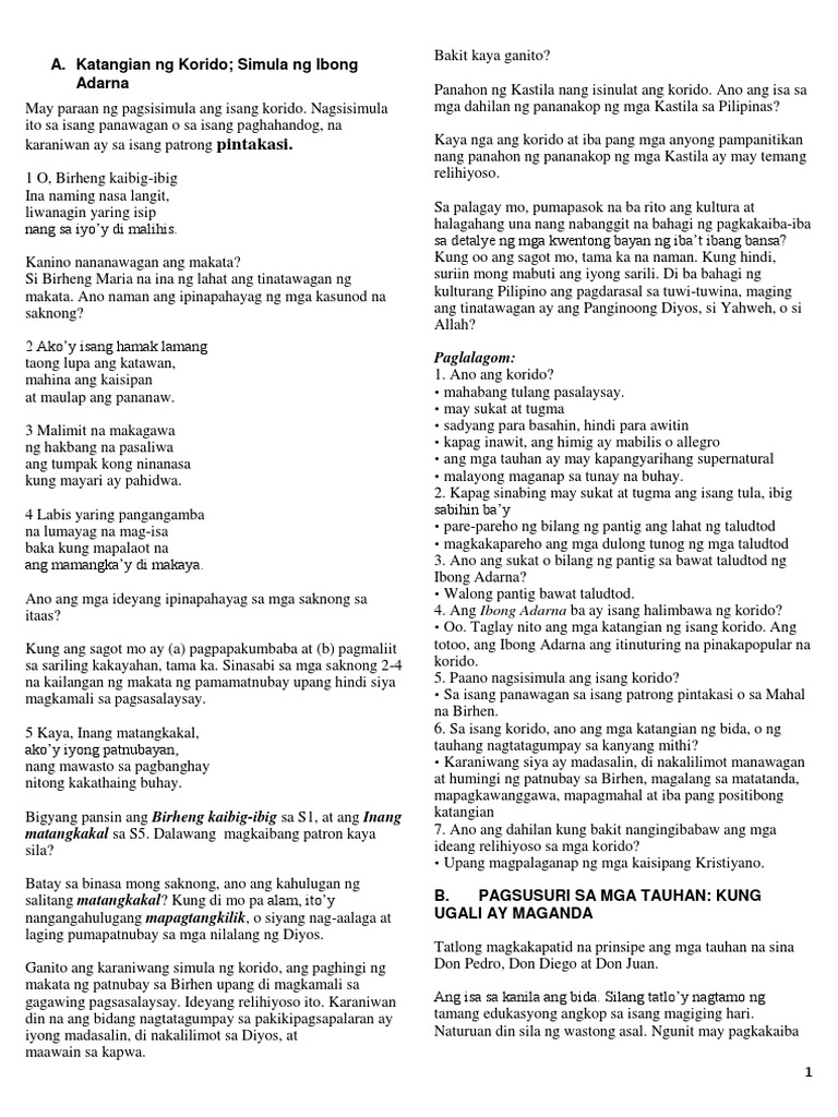 Naibibigay ang kahulugan at katangian ng korido 2. Ikaw ay lumayo sa malaking lampara. Naibibigay ang kahulugan at mga katangian ng korido Naibabahagi ang sariling ideya tungkol sa kahalagahan ng p.
