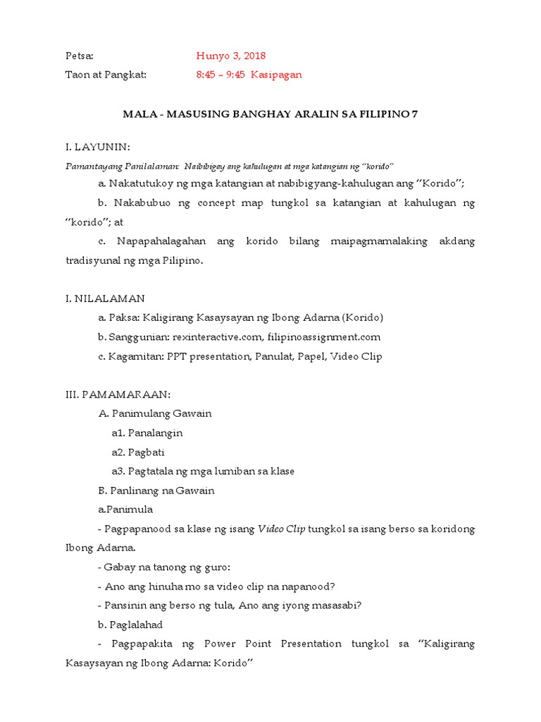 Banghay Aralin Sa Filipino 7 For Cot