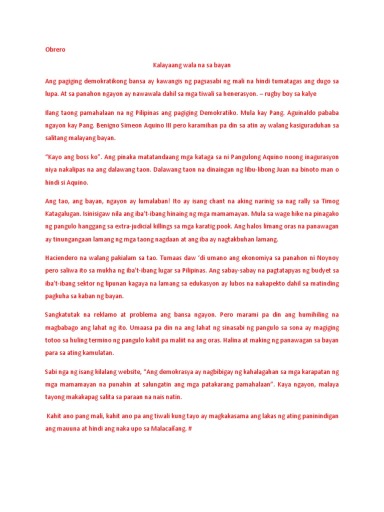 Obrero Kalayaang Wala Na Sa Bayan Ang Pagiging Demokratikong Bansa Ay Kawangis Ng Pagsasabi Ng Mali Na Hindi Tumatagas Ang Dugo