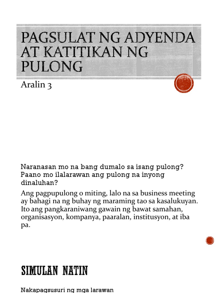 2 Magsimula sa simpleng mga detalye. Layunin nitong ipakita o ipabatid ang paksang tatalakayin sa pagpupulong na magaganap para sa kaayusan ng isang organisadong pagpupulong. Kahulugan at Katangian ng Akademikong Pagsulat Quipper.