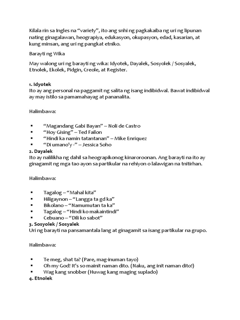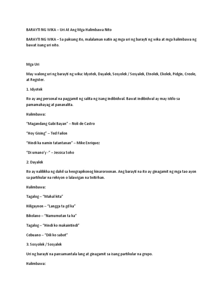 Mga Uri Ng Barayti Ng Wika At Halimbawa