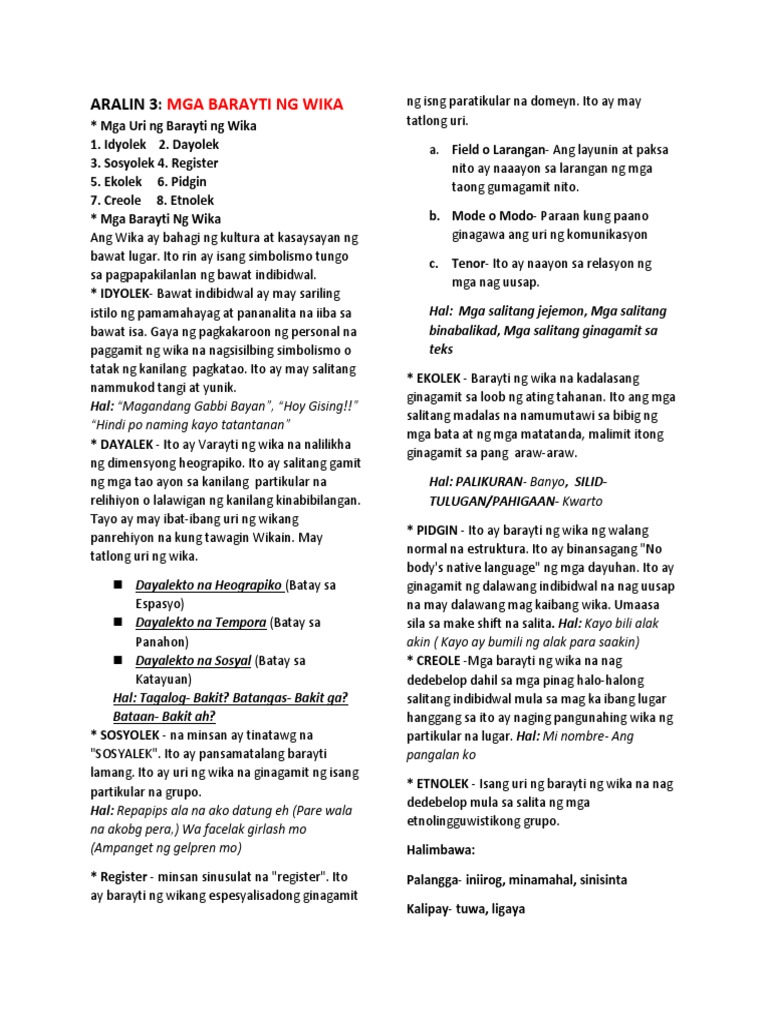 Barayti Ng Wika Docx Barayti Ng Wika U2013 Uri At Ang Mga Halimbawa Nito Barayti Ng Wika U2013 Sa Paksang Ito Malalaman Natin Ag Mga Uri Ng Barayti Ng Course Hero