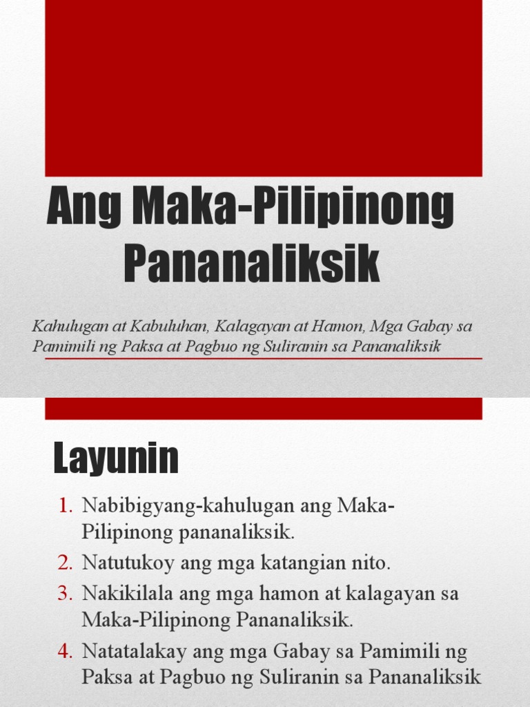Ano ang kahulugan at kabuluhan ng maka-pilipinong pananaliksik. Makapangyarihan itoy lubos na katutubong kalikasan ng buong. At tumatalakay sa mga paksang mas malapit sa puso at. Dito naman ang salitang ginagamit ay galing sa Pilipinas habang ang kahulugan nito ay banyaga.
