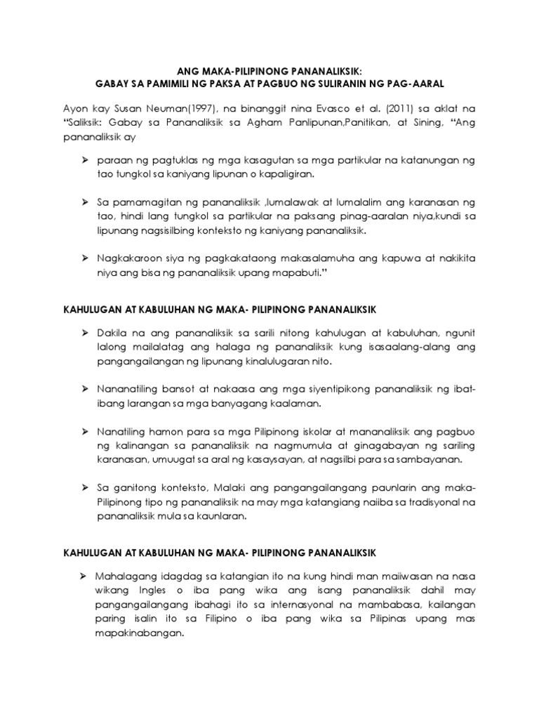 Kahulugan at kabuluhan ng maka-pilipinong pananaliksik Ito ay gumagamit ng wikang Filipino ato mga katutubong wika sa Pilipinas at tumatalakay sa mga paksang mas malapit sa puso at isip ng mga mamamayan. Sa pamamagitan daw ng wikang pambansa nagkaroon ang pag-iintindi sa kasaysayan bilang isang bukas at lantad sa pamimigatan ng pagbibigay kahulugan kabuluhan katuturan. FIlIPINO KAHULUGAN AT KABULUHAN NG MAKA-PILIPINONG PANANALIKSIK Mahalagang idagdag katangiang ito na kung hindi man maiiwasan na nasa wikang ingles o iba pang wika ang isang pananaliksik dahil may pangangailangang ibahagi ito sa intenasyonal na mambabasakailangan pa ring isalin ito sa Filipino o iba pang wika sa Pilipinas upang mas mapakinabangan.
