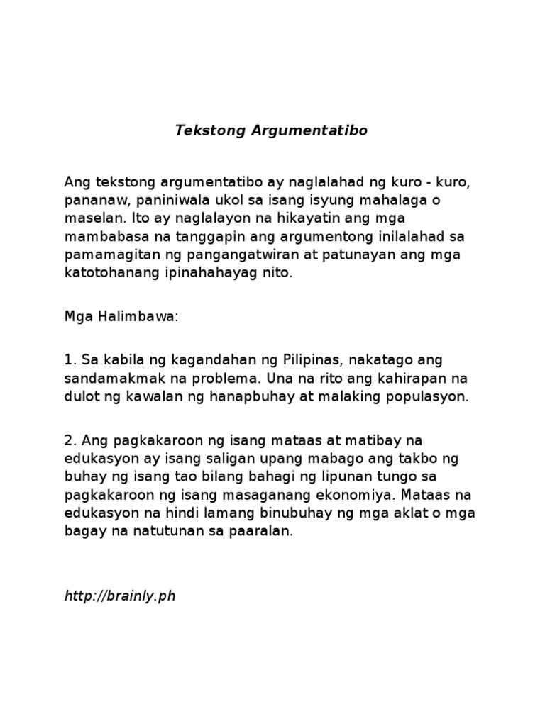 14-16 Mga paraan ng paglalarawan. Ang mga halimbawa ng Tekstong Argumentativ ay ang pagkakaroon ng magkakaibang pananaw ukol sa isang paksa sa kasalukuyan tulad na lang ng mga paksang tungkol sa Droga. Mahalimuyak ang mga bulaklak sa hardin ni Aling Martha.