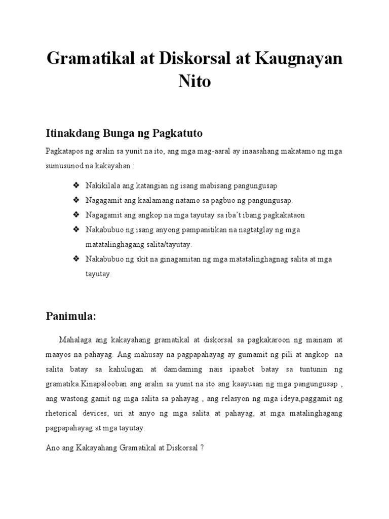 Pagtiyak sa kahulugang ipinahahayag ng mga teksto o sitwasyon ayon sa konteksto Diskurso Nagmula ito sa Middle English na discours at sa late Latin na discursus na nangangahulugang argumento at kumbersayson na maiiugnay sa pagsalita at pagsulat na. Ang kakayahang gramatikal ay pag-unawa at paggamit sa kasanayan sa ponolohiya morpolohiya sintaks semantika gayundin ang mga tuntuning pang-ortograpiya. TEKSTO AT KONTEKSTO NG disKURSO Ang diskorsal ay bahagi ng komunikasyon.