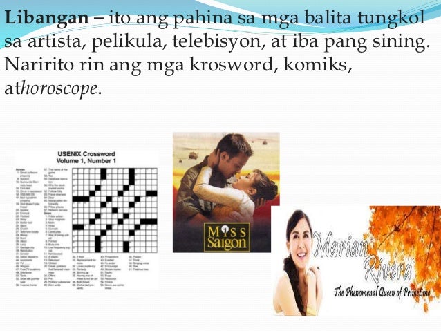 PAGSASANAY panlalawigan pangangalakal komersyo obitwaryo libangan anunsyo klasipikado pampalakasan isports editoryal pangulong tudling pangmukhang pahina 5. Pook para sa paglilibang gaya ng parke teatro museo zoo at iba pa. Anong bahagi ng pahayagan ang naglalahad ng pinakatampok na balita.