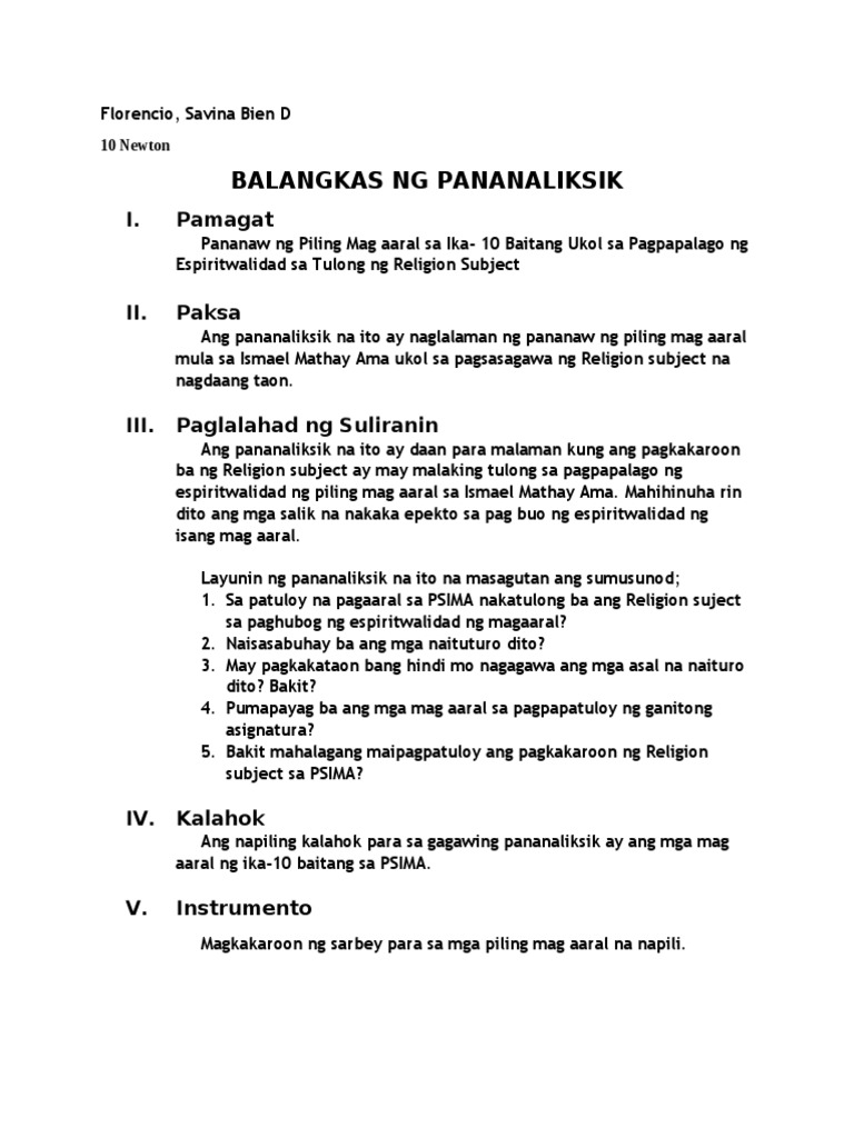 Malaki ang maitutulong ng isinagawang pansamantalang balangkas upang maging madali ang pananaliksik sapagkat may direksiyon kang sinusunod. Ang mga simpleng imbensyon katulad ng ating ilaw telebisyon at mga sasakyan ay produkto ng pananaliksik. Hindi maapektuhan ng pagtatanggal sa kursong Filipino sa kolehiyo ang pananaliksik na maka-Pilipino.
