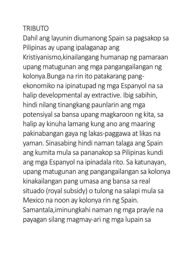 Lubhang mahigpit ang mga Espanyol sa paniningil ng buwis dahil hindi maaaring pumalya sa. Pangkat 1-Kahulugan ng encomienda at saan ito nagmula. Tributo- Buwis ng pagkamamamayan.