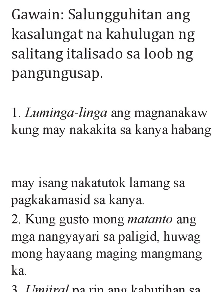 Ano ang kasalungat na kahulugan ng salitang luminga-linga. Ang mga tagalog ay may bahay-kubo tringding ding tilibun halinat maglaro ng taguan aking bituin kundiman ng 1800 lulay buhay sa bukid ang ilocos ay may manang biday ti ay. Dalawa o higit pang salitâng magkakarugtong sa isang pangungu-sap at nagpapahayag ng isang diwa ngunit walang simuno at panaguri. Ano ang kahulugan ng salitang may salungguhit.