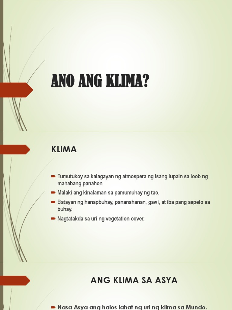 Pag-aaral ng mga katangiang pisikal kinaroroonan hugis sukatanyo vegetation cover ng daigdig pinagkukunang yaman at klima at ang aspetong pisikal ng populasyon nito anyong lupa at tubig na nakakaimpluwensiya sa pagbuo at pag-unlad ng kabihasnan ng mga Asyano at patuloy na humuhubog sa kultura at kabuhayan natin. Asked by Wiki User. KLIMA tumutukoy sa kalagayang atmospera ng isang bansa sa mahabang panahon hal.