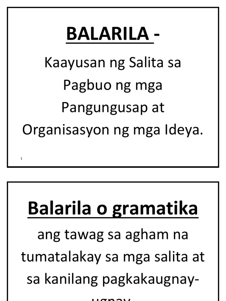 Kahulugan gramatika at retorika. Ang pag-uugnayan ng mga salita sa parirala sugnay at pangungusap ng pahayag. Kaayusan ng Salita sa Pagbuo ng mga Pangungusap at Organisasyon ng mga Ideya BALARILA bala ng dila BALARILA Balarila o gramatika ang tawag sa agham na tumatalakay sa mga salita at sa kanilang pagkakaugnay-ugnay. Ito na marahil ang pinakamagamitin at pinakapopular na paraan ng pagpapahayag.