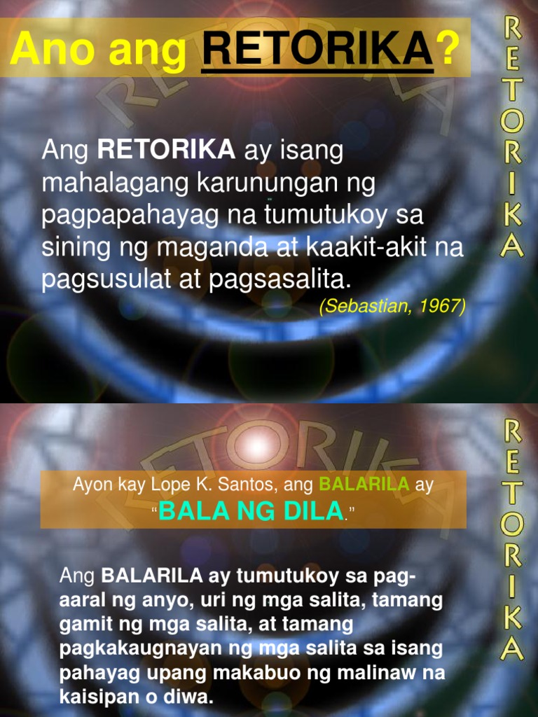 Ito na marahil ang pinakamagamitin at pinakapopular na paraan ng pagpapahayag. RETORIKA Sa paksang ito ating tatalakayin kung ano nga ba ang kahulugan ng salitang retorika at ang mga halimbawa nito. Ang retorika ay isang instrumental na paggamit ng wika.