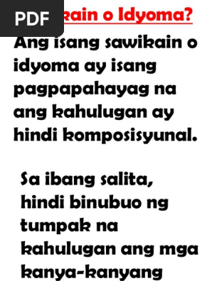 Sawikain o idyoma ay salita o grupo ng mga salitang. Kadalasan sa tuwing nagbabasa tayo ay marami tayong sawikain na makakasalubong. 0 Sign In Sign Up for Free Sign Up.