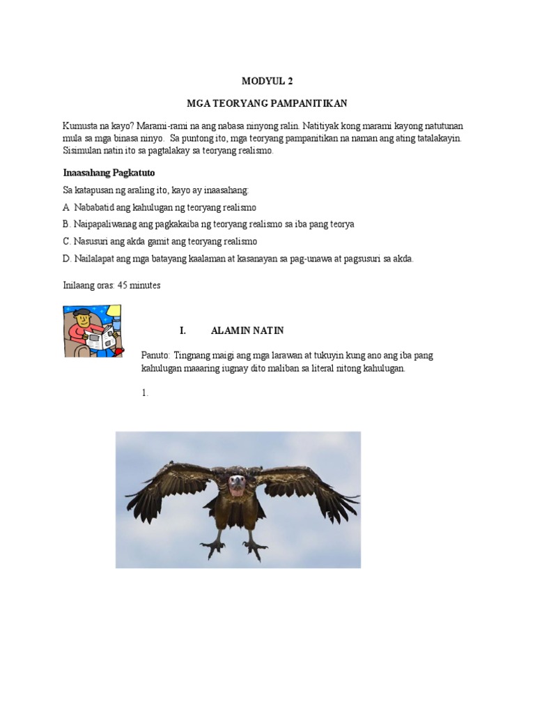 Hangad ng Realismo ang makatotohanang paglalahad at paglalarawan ng mga bagay mga tao at lipunan at alin pa mang pwedeng mapatunayan sa pamamagitan ng pag-iisip ng tao. Naibibigay ang kahulugan ng matatalinghagang pahayag 2. Ano ang kahulugan ng teoryang realismo.