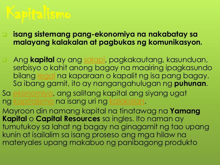Ano ang sistema ng pamahalaan ng mga Muslim. KAPITALISMO isang sistemang pang-ekonomiya na nakabatay sa malayang kalakalan at pagbukas ng komunikasyon. Ang sistemang pang-ekonomiya ay isang uri ng pamamaraan na kinabibilangan ng produksyon pamamahagi at paggamit ng mga serbisyo o produkto sa pagitan ng mga tao na sakop ng isang lipunan.
