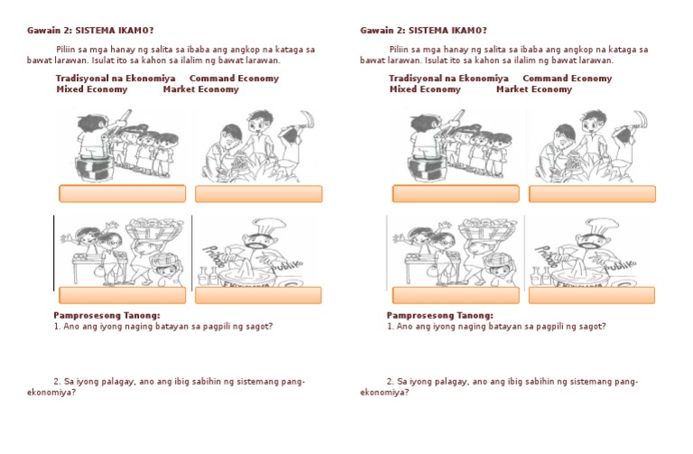 Sa pagsapit ng ika-13 dantaon ay humina na ang sistemang pyudal. Piliin sa mga hanay ng salita sa ibaba na angkop sa bawat larawan. Ang sistemang pang-ekonomiya ay isang pamamaraan na kinakasangkutan ng produksiyon pamamahagi at paggamit ng mga produkto o serbisyo sa pagitan ng mga entidad sa loob ng isang partikular na lipunanIto ang kaparaanan na ginagamit ng lipunan upang gumawa at mamahagi ng mga produkto at serbisyo.