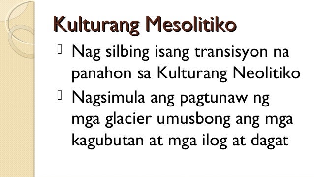 Kahulugan ng panahon ng mesolitiko. Kailan nagsimulang manirahan ang mga Asyano sa pampag ng ilog at dagat. Naging suliranin ang panustos ng pagkain dulot ng mga pagbabago sa klima. Paleolitiko Mesolitiko at Neolitiko.