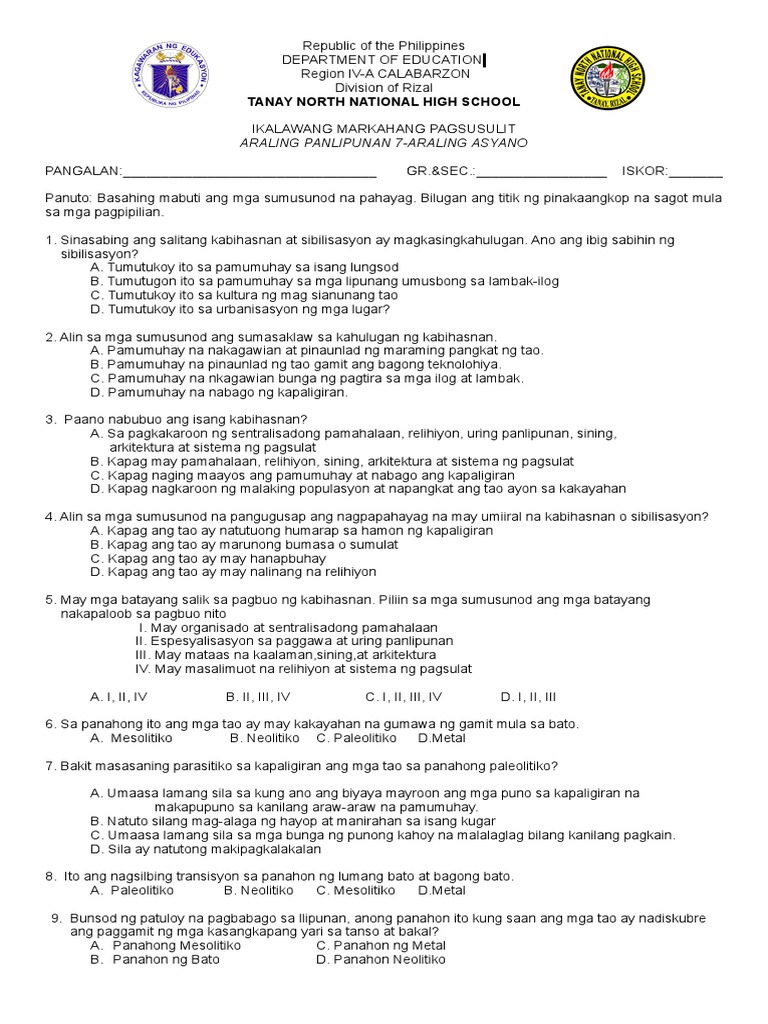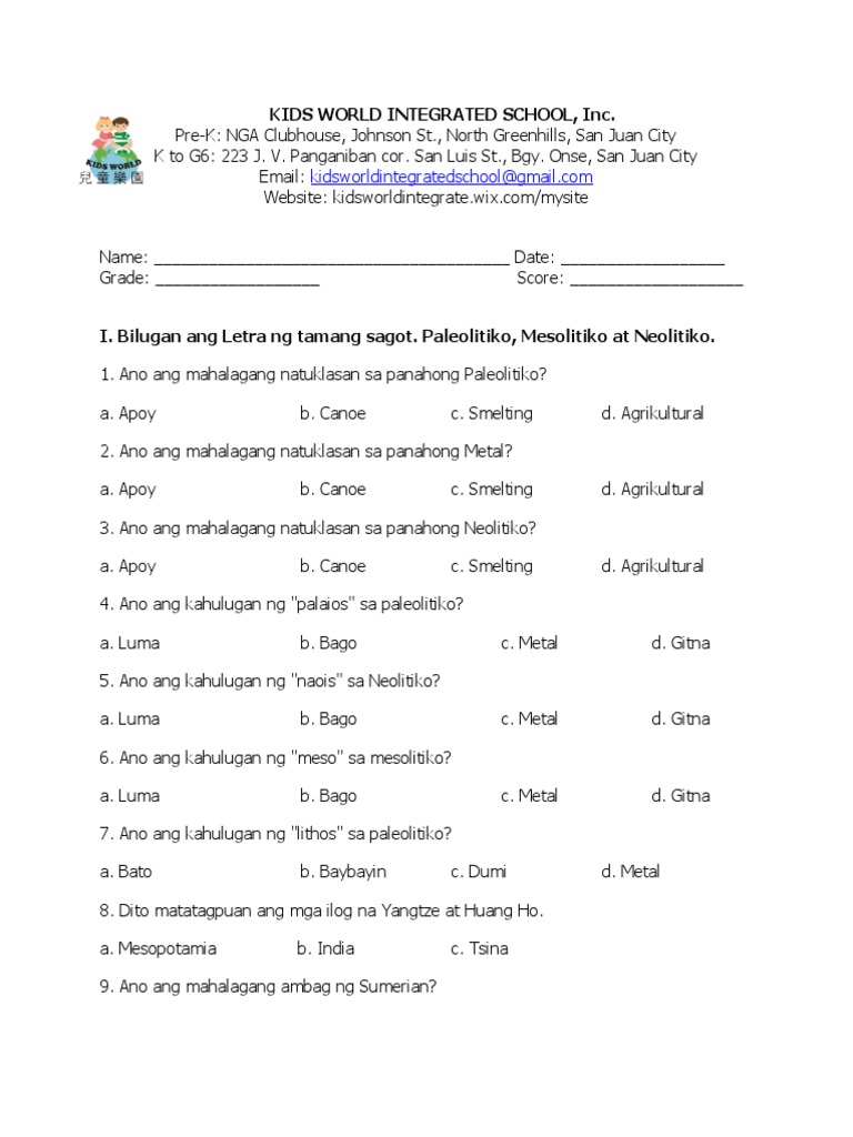 Quiz For Paleolitiko Mesolitiko At Neolitiko Docx
