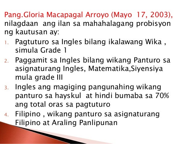 Bilang patakaran ayon sa kautusang ito ituturo ang English simula sa unang baitang at gagamitin itong wikang panturo sa English. Ang madalas na mapagkamalan na wikang opisyaa. Katawan Nilalaman Pagkukumpara ng Wikang Filipino sa Wikang InglesSa kabila nito hindi pa rin ito sapat upang masabing intelektwalisado ang wikang Filipino kung ikukumpara sa ibang wika tulad ng wikang ingles.