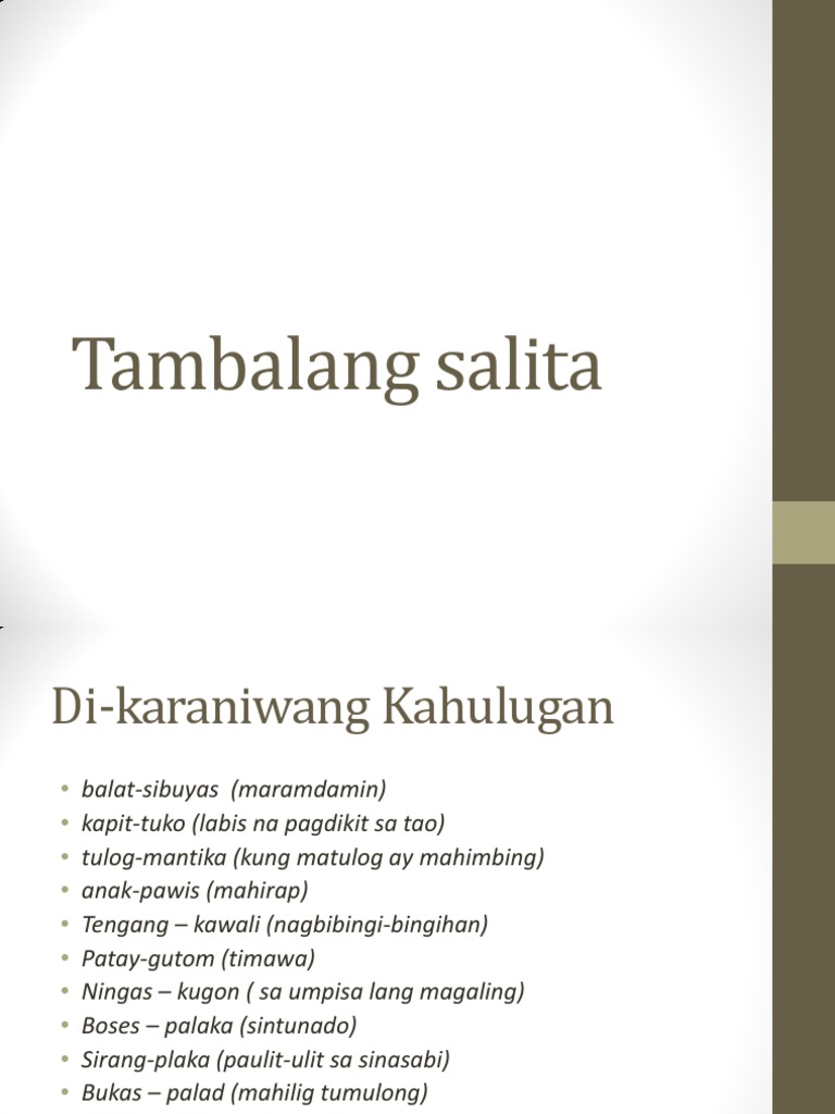 Mga tanong sa Tagalog. Modyul 1 mga halimbawa lamang Learn with flashcards games and more for free. 20 halimbawa ng tambalang salita na may kahulugan 1Taingang-kawali-taong nagbibingi-bingihan 2Ingat-yaman - tresyurera o tresyurero tagapag-ingat ng salapi o ari-arian ng isang tao oorganisasyon 3Patay-gutom - timawa palaging gutom matakaw 4Akyat-bahay - magnanakaw mang-uumit sa bahay ng iba 5Boses-palaka - pangit kumanta sintunado o wala sa tono 6Ningas-kugon - sinisimulan ang.
